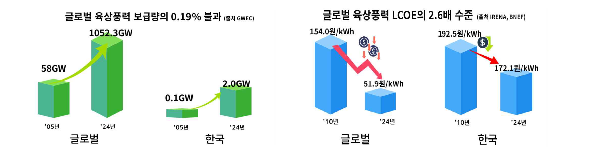 국토의 약 70%가 산지인 우리나라 지형 특성상, 풍황이 좋은 고지대를 중심으로 육상풍력 잠재력이 크지만 복잡한 인허가와 각종 규제로 보급은 그동안 제자리걸음을 해왔다. 현재 국내 육상풍력 보급은 연간 0.1GW 수준, 누적 2GW에 그치고 있다.