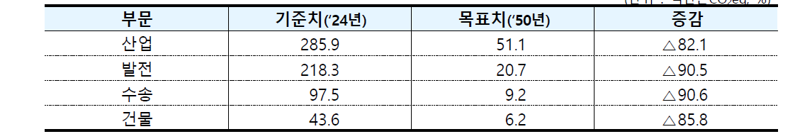 정부는 ‘2050 탄소중립 시나리오’를 통해 산업·발전·수송·건물 등 부문별 감축 목표를 제시했다. 건물 부문의 온실가스 배출량은 2024년 4,360만tCO₂eq에서 2050년 620만tCO₂eq로 줄이는 것이 목표다. 같은 기간 산업(–82.1%), 발전(–90.5%), 수송(–90.6%)과 비슷한 수준의 대폭 감축이 요구된다.