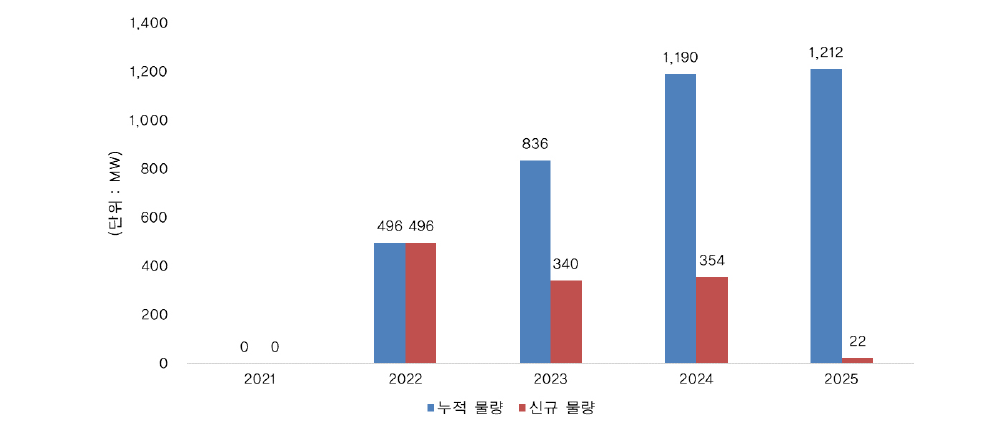 국내 PPA 계약은 제도 도입 이후 빠르게 증가했지만, 여전히 RE100 이행 수준에는 크게 못 미치는 상황이다. 2025년 기준 PPA 누적 계약 물량은 약 1.2GW 수준으로, 이를 전력량으로 환산해도 국내 기업들의 재생에너지 예상 수요의 2%도 되지 않는다. 특히 2025년 신규 PPA 계약 물량은 급감하며 확산세가 둔화되는 모습이다.