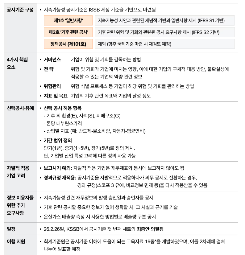 공시 기준도 글로벌 표준을 기반으로 마련됐다. 한국회계기준원 지속가능성기준위원회(KSSB)는 2월 26일 지속가능성 공시 기준 첫 번째 세트를 확정했다. 이 기준은 글로벌 공시 표준을 제정하는 ISSB(International Sustainability Standards Board)가 발표한 기준을 기반으로 설계됐다.