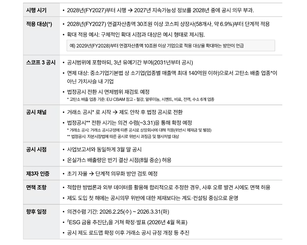 로드맵 초안에 따르면 지속가능성 공시는 2027년 사업연도(FY2027) 정보부터 적용된다. 기업들은 해당 정보를 2028년 사업보고서와 함께 공시해야 한다.