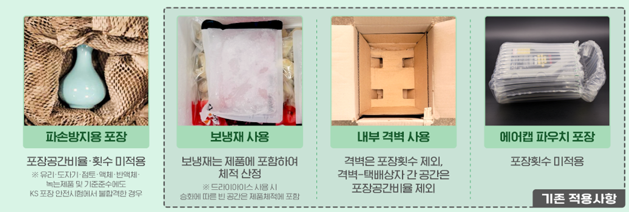 또 ▲여러 제품을 함께 포장하는 ‘합포장’ ▲포장재 재사용 ▲KS 포장 안전 시험에 불합격해 추가 완충이 필요한 경우 등도 규제 적용 대상에서 제외된다.