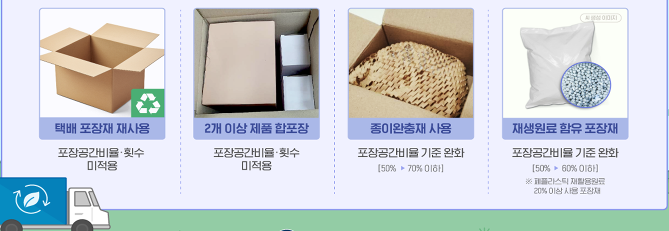 친환경 포장재 사용을 유도하기 위한 완화 규정도 포함됐다. 재생원료가 20% 이상 포함된 비닐 포장재를 사용할 경우 포장공간비율 기준을 60%까지 허용하고, 종이 완충재를 사용할 경우에는 **70%**까지 인정하기로 했다.