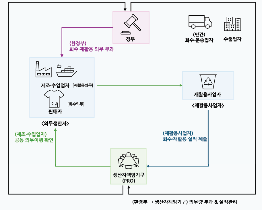 초기 Pre-EPR은 생산자(브랜드·수입사)가 의무량을 부담, 정부는 회수·선별 인프라 구축, 공공기관 근무복 등 단일 소재 의류를 우선 회수하는 방식을 제시했다.