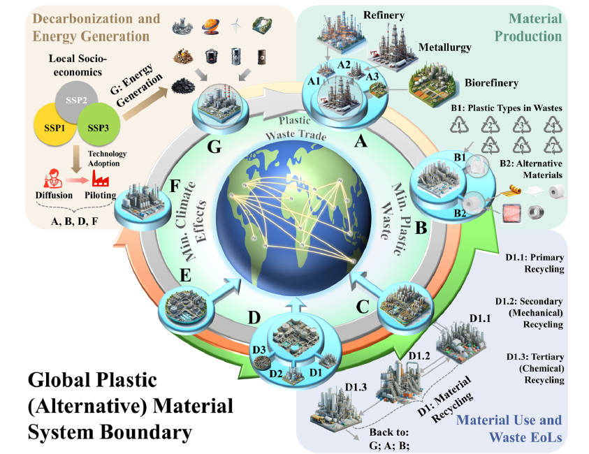이들은 지난해 발표한 '탈탄소 에너지: 2040년 제로 폐기물 달성을 위한 플라스틱 폐기물 거래' 논문에서, 북미와 유럽은 플라스틱 사용량의 56.7%를 유리·금속·생분해성 소재로 대체하고, 고도 화학적 재활용과 바이오매스 기반 CCU를 적용할 경우 2035~2040년 사이 연간 추가 폐기물 발생을 제로 수준으로 낮출 수 있다고 밝혔다. 또 2060년까지 기후 부담도 34.9%나 감소하는 것으로 나타났다.