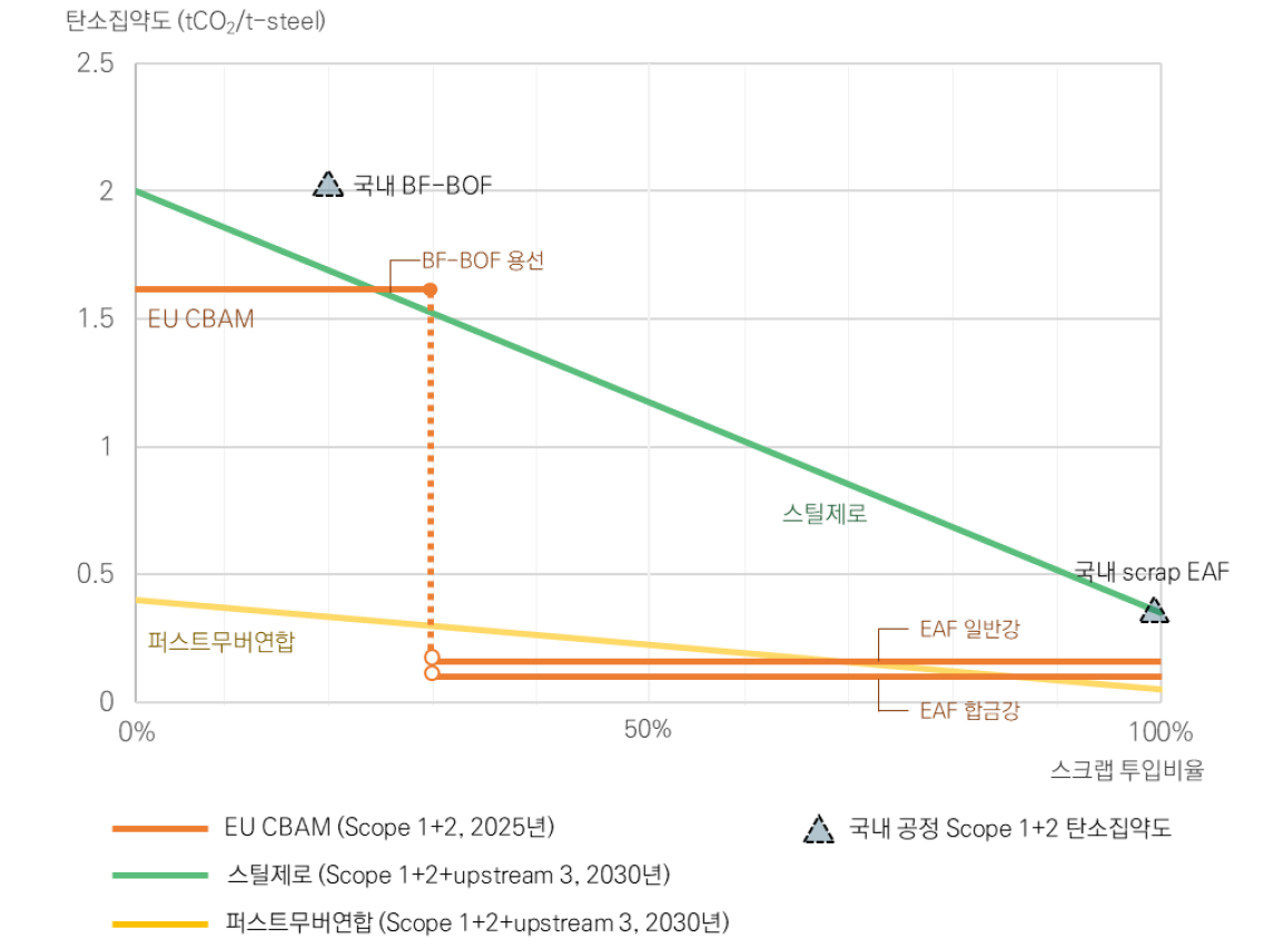 그러나 국내 철강업계의 주력 공정인 고로-전로(BF-BOF)는 국제 기준과 큰 격차를 보이고 있는 점이 문제다. 보고서에 따르면 국내 BF-BOF 공정의 평균 탄소배출량(조강 기준, Scope 1+2)은 t당 약 2.1tCO₂ 수준이다. 반면 국제에너지기구(IEA)가 제시한 ‘니어 제로 철강’ 기준은 스크랩 투입 비율에 따라 t당 0.05~0.4tCO₂, 민간 인증기구 리스폰서블스틸(ResponsibleSteel)과 스틸제로가 요구하는 범위도 이 안에서 설정된다.