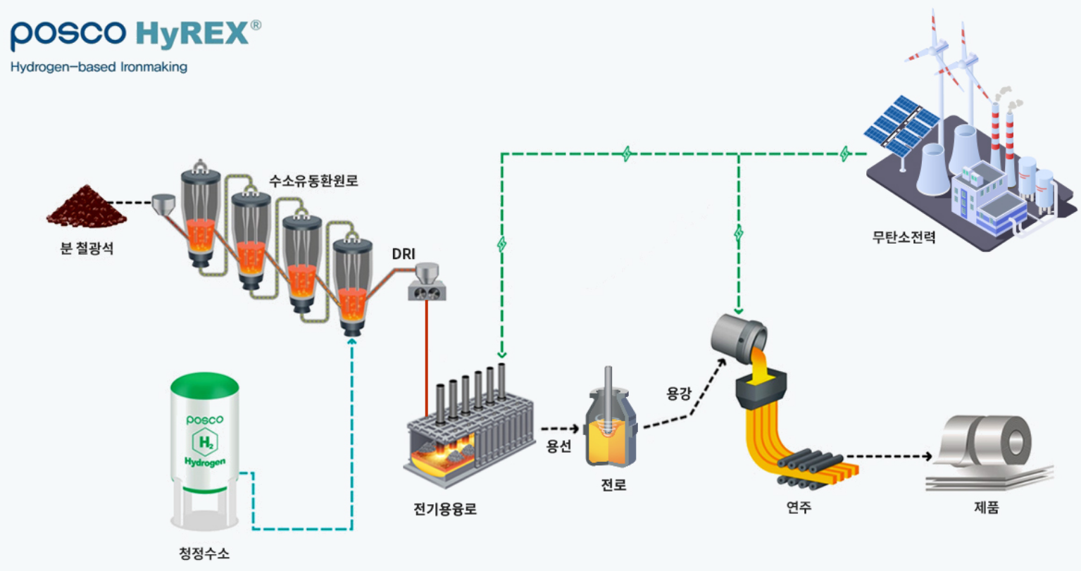 2030년까지 국내에서 상업 생산이 가능하고 국제 기준을 일정 부분 충족할 수 있는 공정으로는 ▲고로–전기로 복합공정 ▲포스코의 수소환원제철 ‘하이렉스(HyREX)’ ▲DRI 기반 전기로 공정(DRI–EAF) 세 가지가 꼽힌다.