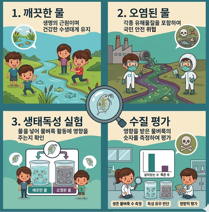 물벼룩 배양장치는 수조 내 미세망을 통해 어린 개체만을 선택적으로 분리하는 구조로 설계된 점이 핵심이다. 시험에 사용하는 어린 개체의 선별 채집이 쉬우며, 상처나 스트레스로 인한 사멸을 최소화할 수 있다. 이 기술은 2024년 국내 특허 등록이 완료됐으며, 연내 민간 기술이전이 완료될 예정이다.