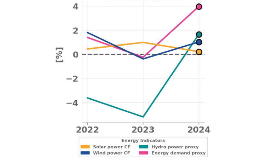 보고서는 4가지 핵심 에너지 지표 즉, 풍력·태양광 설비계수, 강수량 기반 수력 지표, 온도 기반 전력수요 지표를 바탕으로 2024년 기후 극단 현상이 에너지 시스템에 미친 영향을 분석했다.