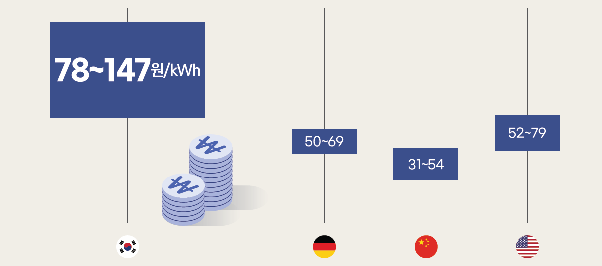 그러나 보고서는 국내 재생에너지 조달비용이 기업 RE100 이행의 최대 장애요인으로 꼽았다. 한국수출입은행(2024) 자료에 의하면 2023년 고정형 태양광 기준 주요국 균등화 발전단가가 인도 2647달러/MWh, 중국 3154달러/MWh, 독일 5069달러/MWh, 미국 5279달러/MWh인 반면, 한국은 78~147달러/MWh 수준으로 평가된다.