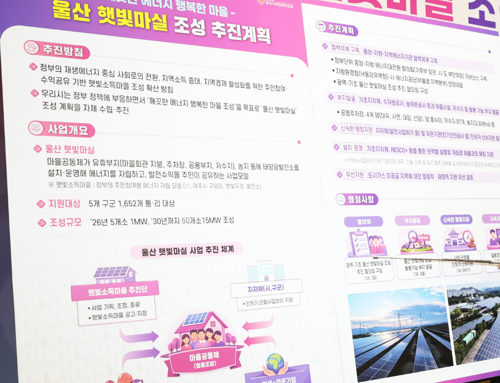 울산광역시는 같은 날 주민 참여형 태양광 프로젝트 ‘햇빛마실 조성 사업’을 본격화한다고 발표했다. 마을공동체가 태양광발전소를 직접 설치·운영하고, 발전 수익을 마을 발전기금으로 환원하는 구조다.